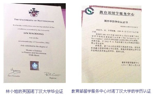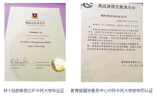 记者查看了林小姐出示的由教育部留学服务中心出具的两份“国外学历学位认证书”,其中一份写着“经核查,新西兰怀卡托大学系新西兰正规高等学校,林XX所获学士学位证书表明其具有相应的学历,经查无误”。另一份也清楚说明“英国诺丁汉大学是英国正规高等学校,林XX所获硕士学位表明其具有相应的学历”。