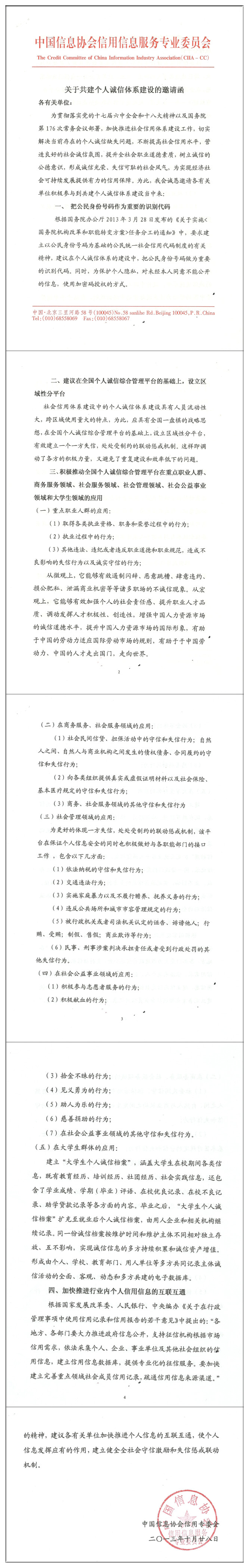 日前,中国信息协会信用信息服务专业委员会向各级有关单位发出了“关于共建个人诚信体系建设的邀请函”,以推动在“全国个人诚信公共服务平台”的大平台基础上,设立区域性分平台运作模式,建立重点职业人群、商务服务、社会服务、社会管理领域、以及社会公益事业领域和大学生群体中的应用,让诚信档案全方位覆盖个人诚信,填补信用体系空白。 全国个人诚信公共服务平台自建成以来已收录近千万条个人职场诚信档案,共建单位达八十几万家企业,但信息的力量是靠流通实现的。信专委的函中指出,社会信用体系建设中的个人诚信体系建设具有人员流动性大,跨区域使用量大的特点。而当前个人诚信体系建设最突出的现实是“信息孤岛”现象严重,区域之间、部门之间互不相通。有人甚至调侃道,“一个省骗一次,全国可骗三十多年”。 “信息孤岛”的产生,一方面是因为部门之间信用数据封锁严重,另一个重要原因在于区域之间信用数据割裂。我国目前已建、在建的信用信息共享平台大多是“信息孤岛”,不利于数据集中统一和信息共享,也造成了重复建设和资源浪费。北京、天津、上海、江苏、浙江等少数地方建起省级统一信用信息共享平台,也只能归集、处理本辖区内的信用信息,与外省仍存“数字鸿沟”。 实现行业内、地区内信用信息互联互通的基础上,大力推动信用信息在全国范围的互联互通,建设覆盖全国的个人诚信体系已是当务之急、势在必行。 打破信息割裂需付出成本,但信息共享会产生更大效益。为此,全国个人诚信公共服务平台从全国一盘棋的战略思想出发,在全国大平台的基础上,设立区域性分平台,与很多省市信用中心或第三方公司或机构签署了战略合作协议,有效建立一个一方失信,处处受制的联动惩戒机制。这样既调动了各方的积极力量,又避免了重复建设和效率低下的问题。这种运作模式开创了个人诚信体系建设的新模式——把“个人诚信”在全国范围内建立以身份证号码作为识别手段的一种让守信者收益,失信者受戒的长效机制、约束机制、激励机制、联动机制。 相关资料:中国信息协会信用信息服务专业委员会“关于共建个人诚信体系建设的邀请函” |